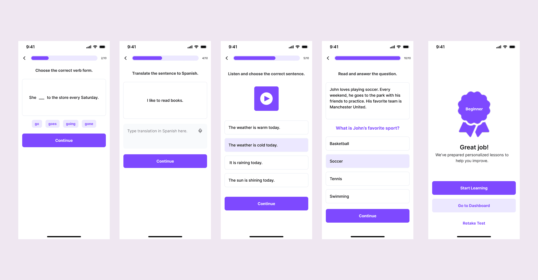 For users who aren't sure of their level — or want to verify it — a short adaptive test covers grammar, translation, listening, and reading comprehension. The result feeds directly into the recommended learning path.