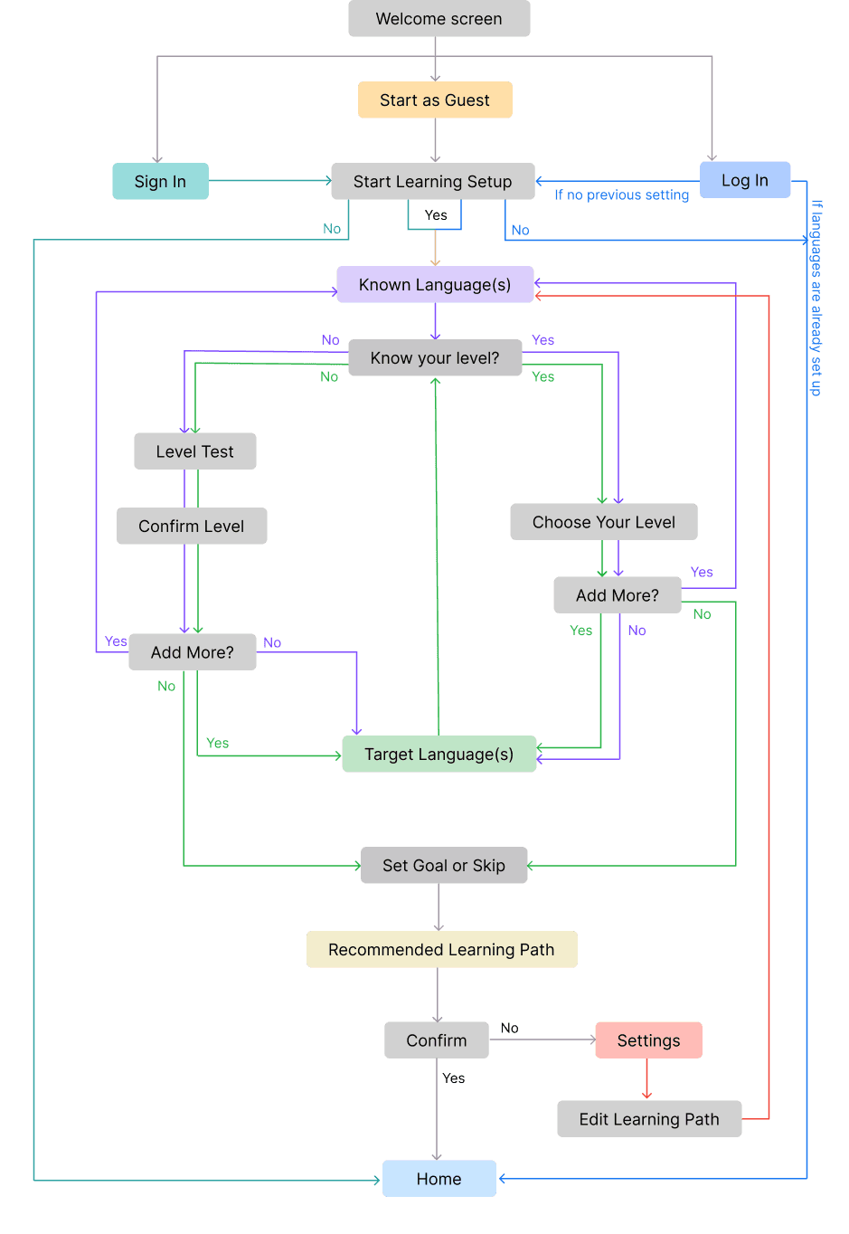 Refined user flow after multiple iterations adapting to the complexity of multilingual experience.