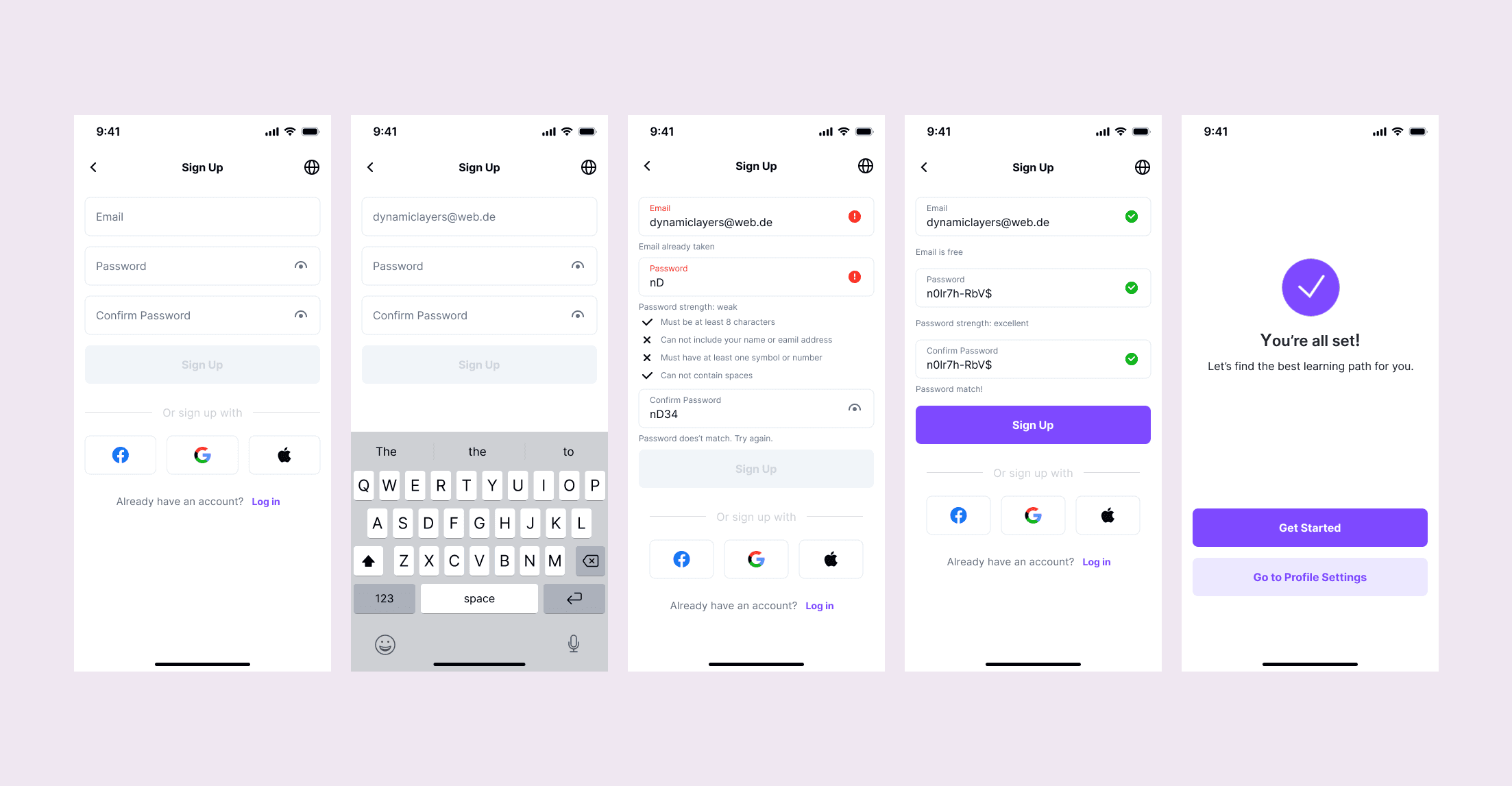 Registration includes live validation, real-time password strength feedback, and clear error states — so users never have to guess what went wrong. Social sign-up via Google, Facebook, and Apple reduces friction for new users.