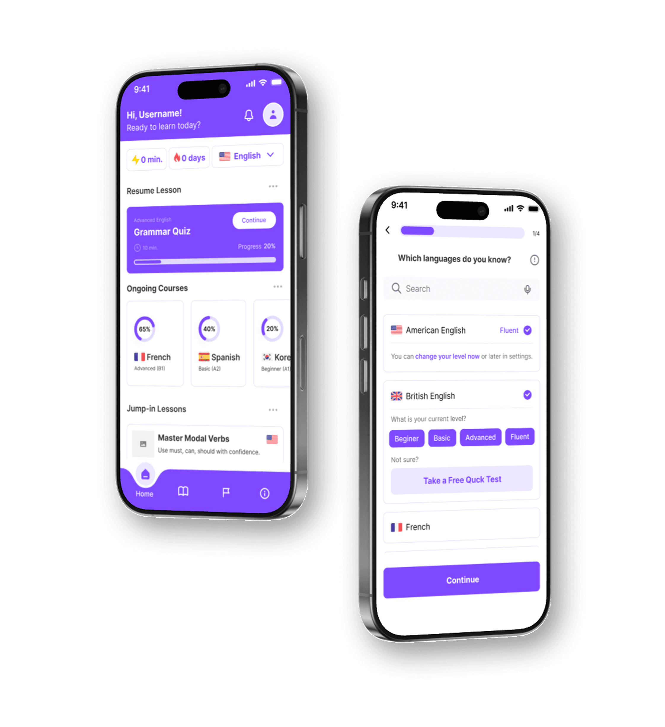 Choose your known languages (test or manual), add one or more target languages, set a learning goal (optional), get a recommended path instantly, review and tweak your plan, start learning with a personalized dashboard.