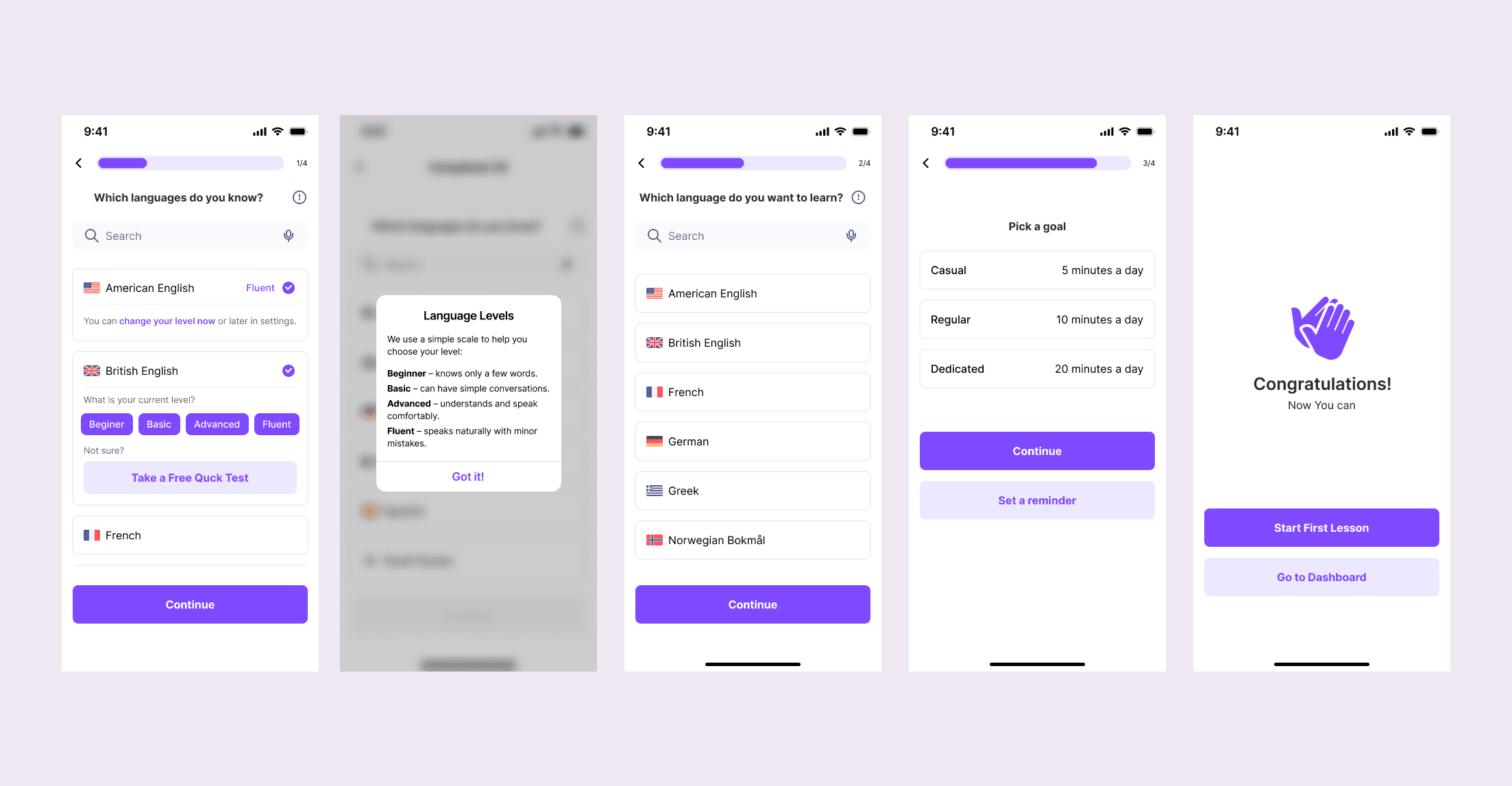 I tried a CEFR progress bar (A1→C2) for proficiency levels. It looked clean but tested poorly — too small on screen, unfamiliar to users who don't know the European framework.