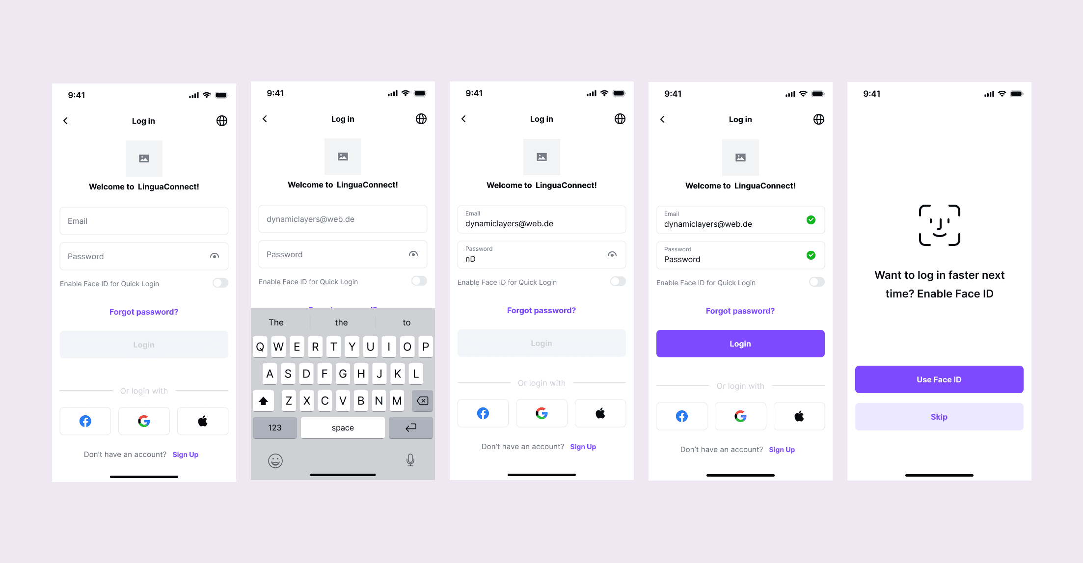 Returning users get a familiar, distraction-free login screen. Face ID is offered as an optional shortcut — never forced, always skippable.