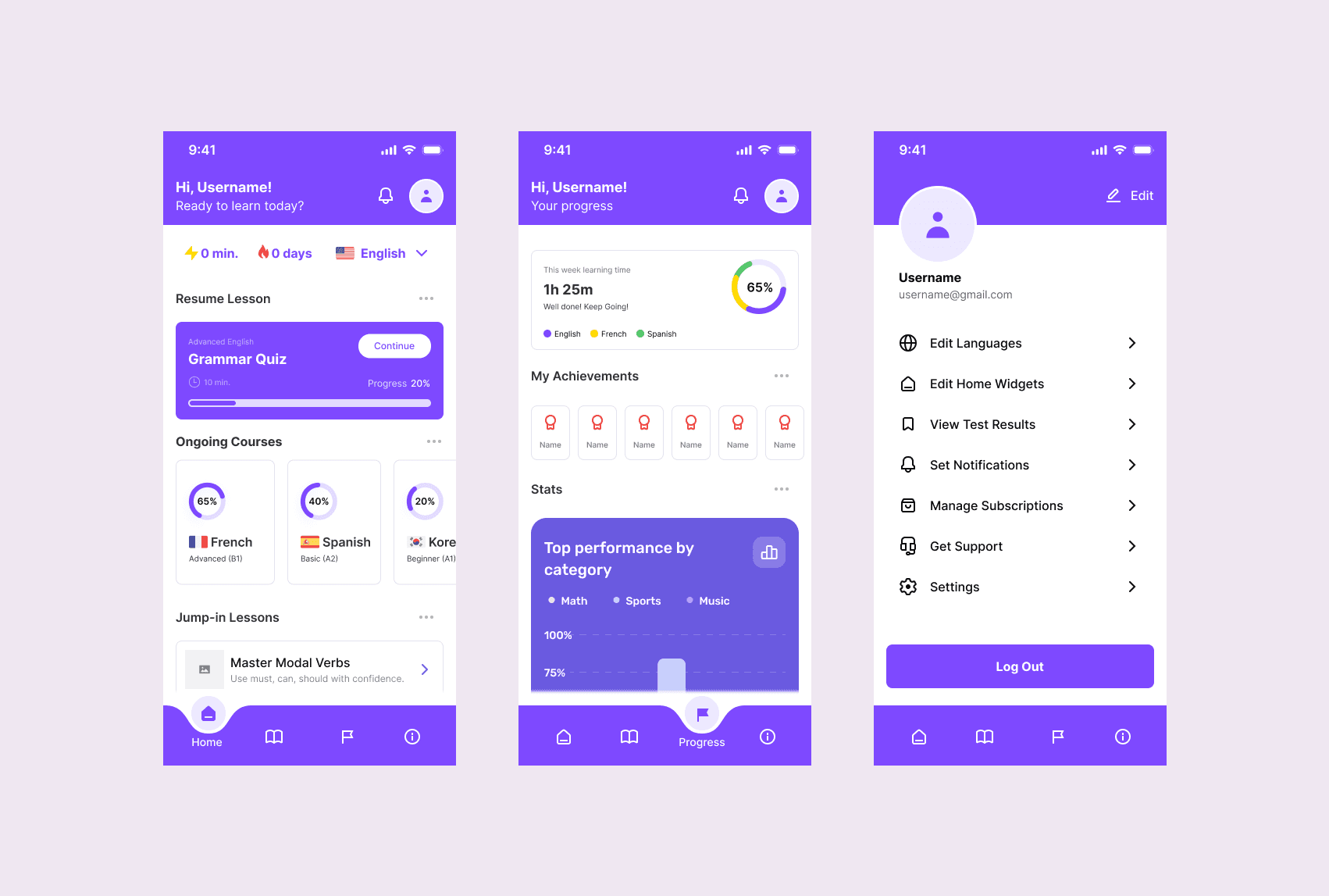 The main screen surfaces what matters most: current courses, time spent, achievements, and a quick-jump to the last lesson. Progress tracking is visual and motivating without being overwhelming.