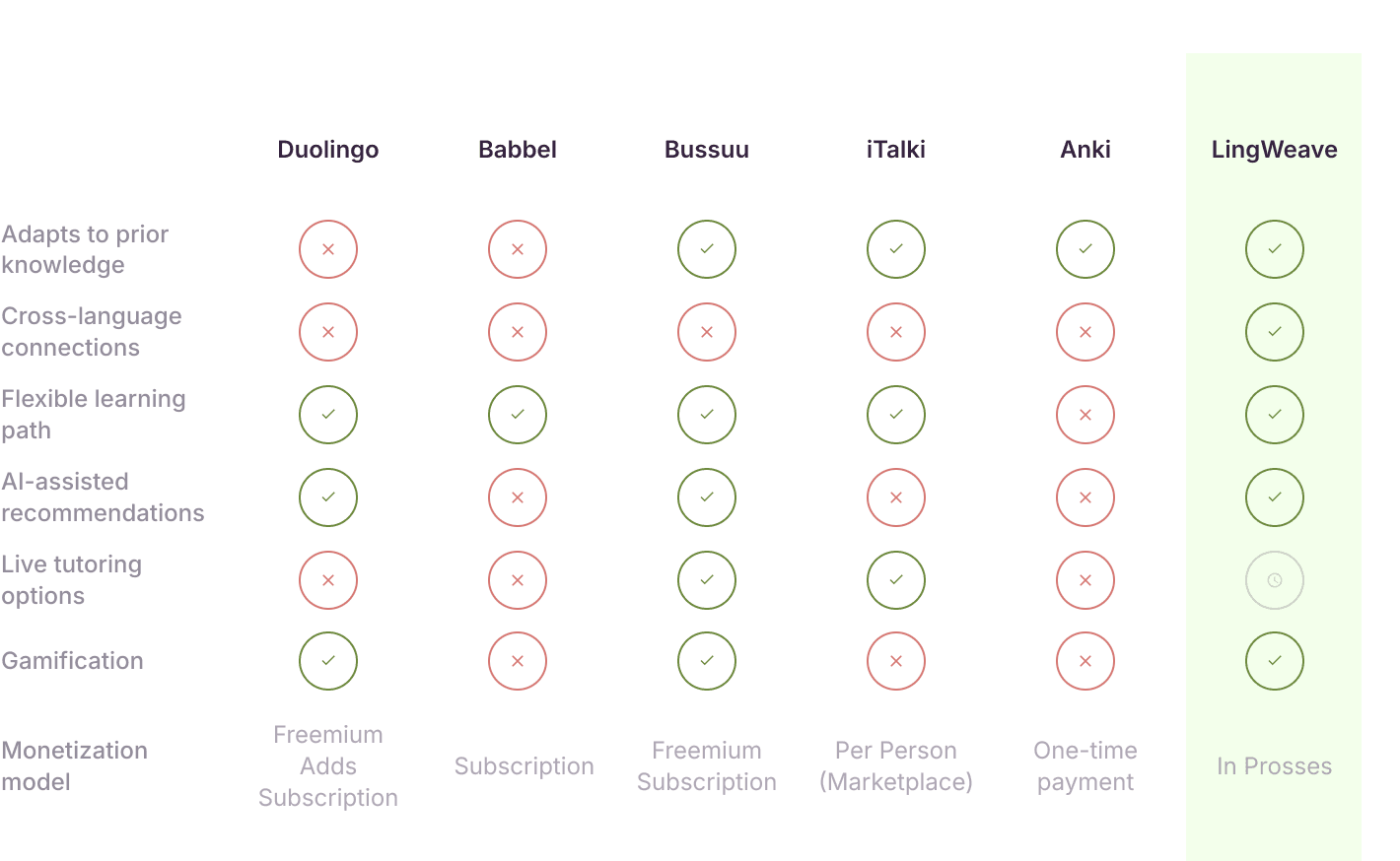 This analysis highlights key gaps in the current market—especially for multilingual learners. With this in mind, the next step is to explore how LingWeave can bridge these gaps and create a more personalized, efficient language learning experience.
