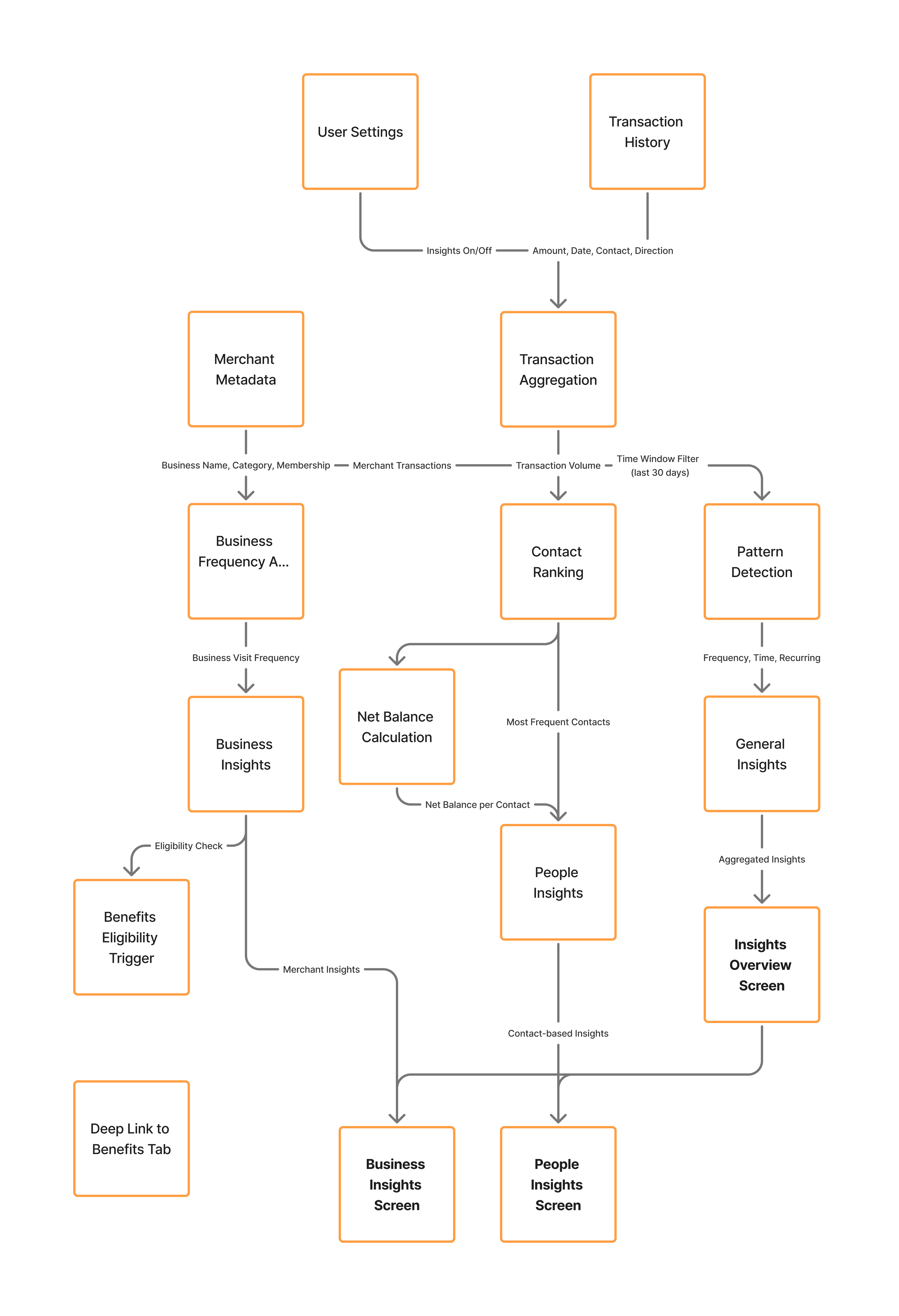 Insights are generated from existing transaction data, aggregated over the last 30 days and interpreted through three lenses: general patterns, people exchanges, and business activity — all powered by the same underlying data system.
