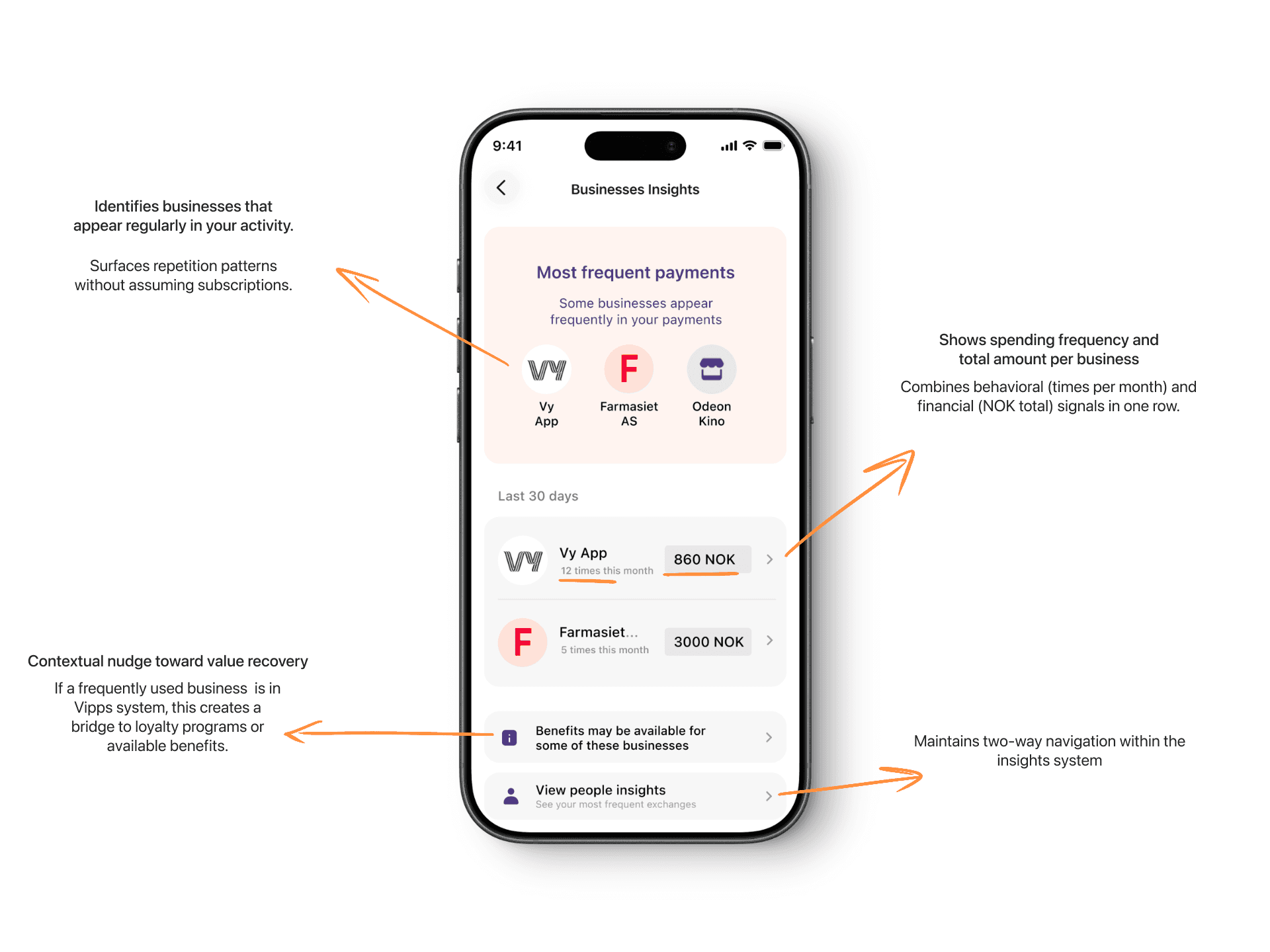 Together, these four principles defined a clear design space: show users what's already there, let them choose when to look, and make sure it feels like Vipps did it themselves.