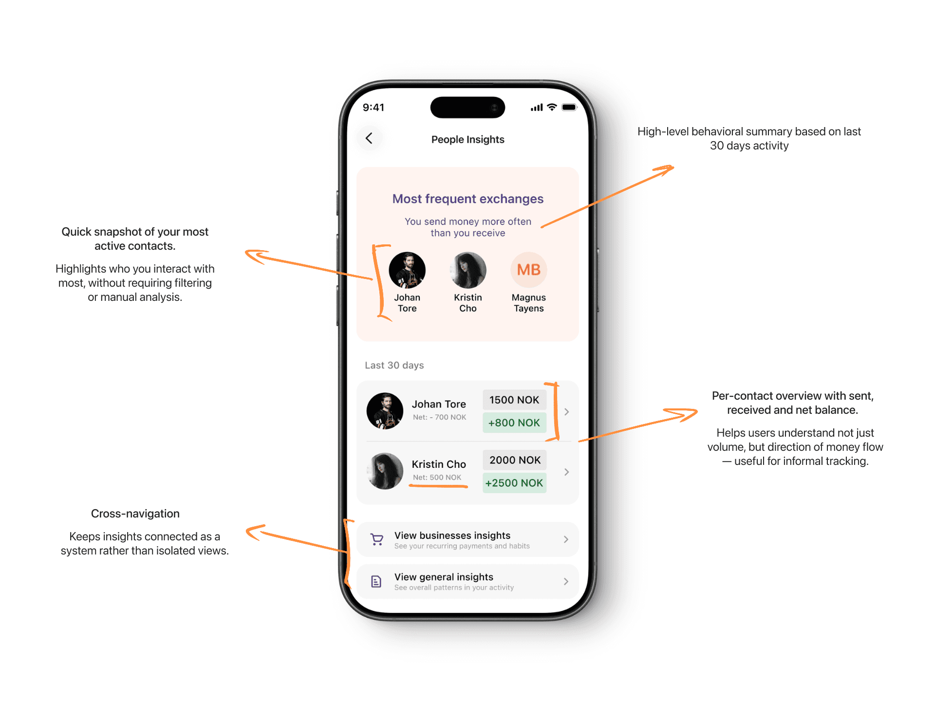 What I'd keep: the constraint to not give advice. That felt right from the beginning and every piece of feedback reinforced it. In a space where so many fintech products try to coach users toward better behavior, "just show me what's there" is a genuinely different position — and I think the right one for Vipps specifically.