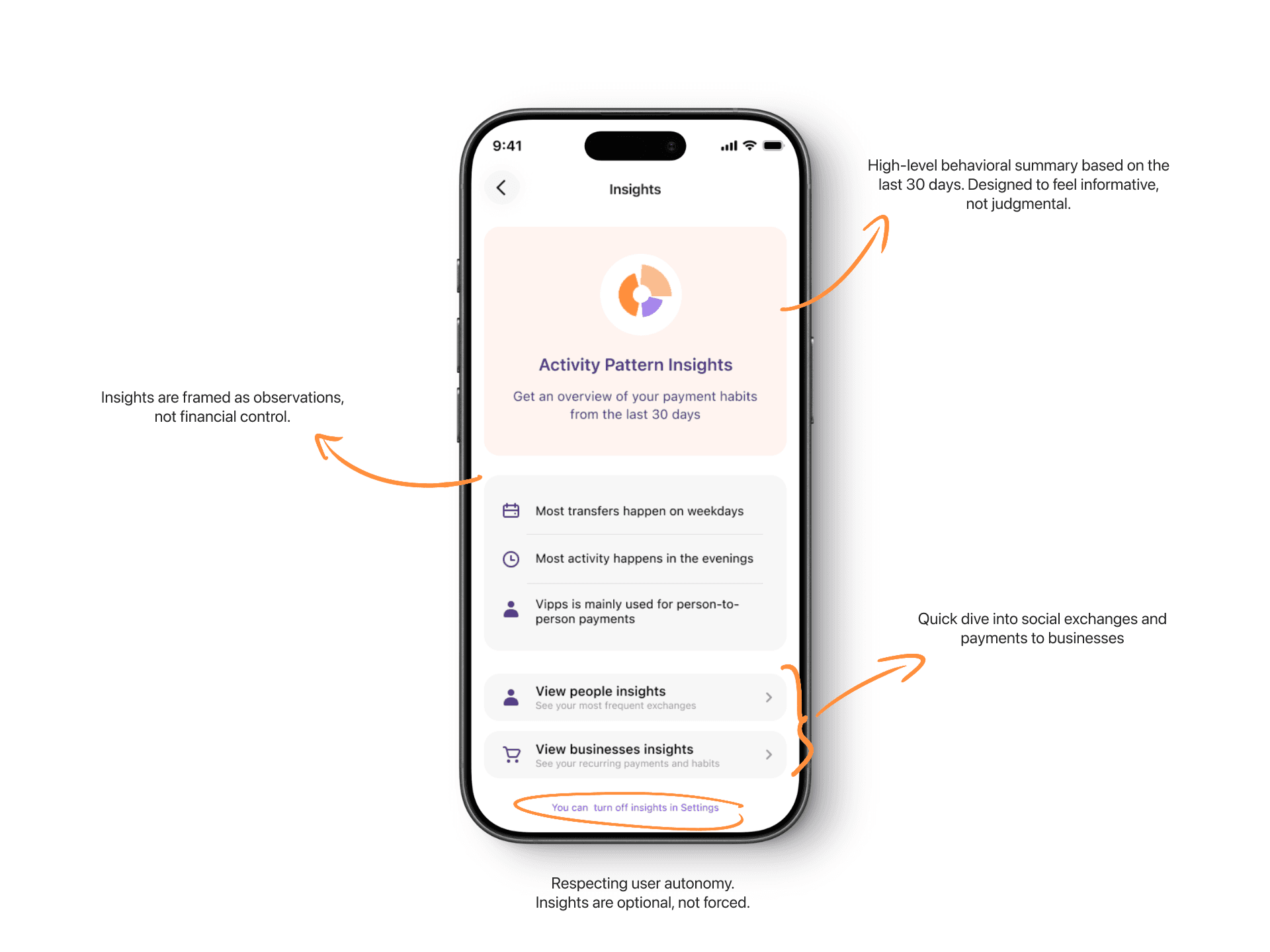Financial advice carries emotional weight. "You spent a lot on coffee" is a judgment, even when framed neutrally. Vipps is trusted because it doesn't make you feel watched. The feature had to observe without commenting.